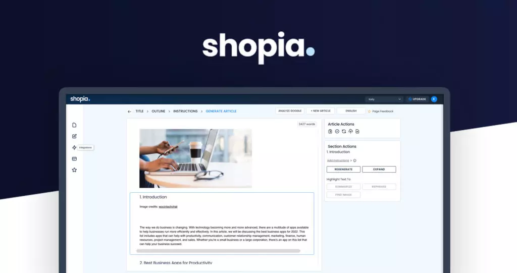 Article researcher, writer and SEO assistant – Shopia will find groups of key articles to write for your niche, analyze the top Google results for each article and then generate content that hits key SEO metrics. Content built to outrank the top results, and all in a few clicks.